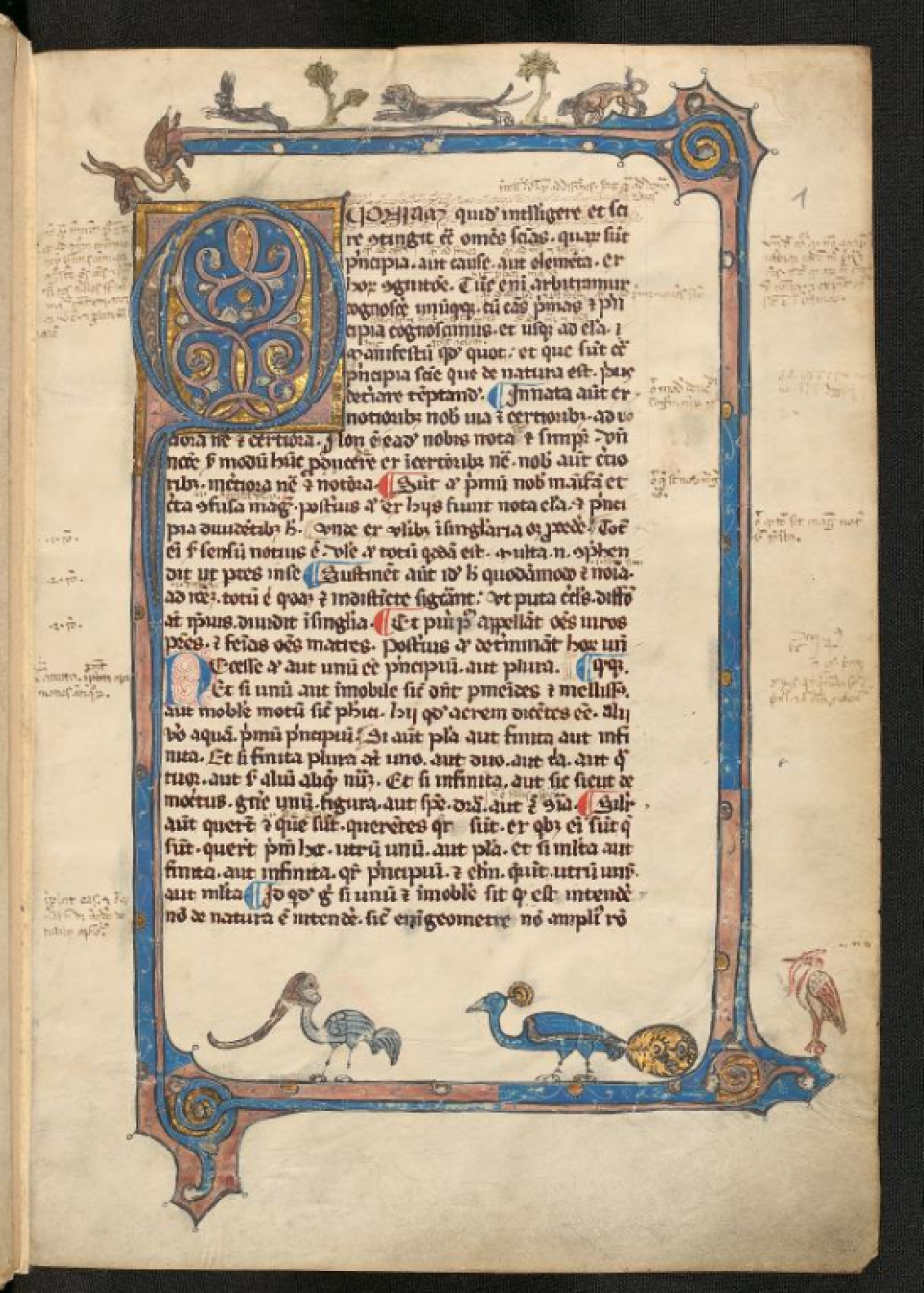 Die prächtig gestaltete erste Seite der Pergamenthandschrift besticht dabei im Ganzen: Blatt 1r erstrahlt in den schönsten Deckfarben, verziert mit echtem Blattgold. Ein künstlerisches Meisterwerk mit tierischem Witz: man beachte die jagenden Hunde und Hasen, Pfauen mit seltsamen Gesichtern, den hungrigen Reiher und den mürrischen Drachen, der als umrandende Zierranke dient. Was der mittelalterliche Maler wohl noch für Ideen hatte?
